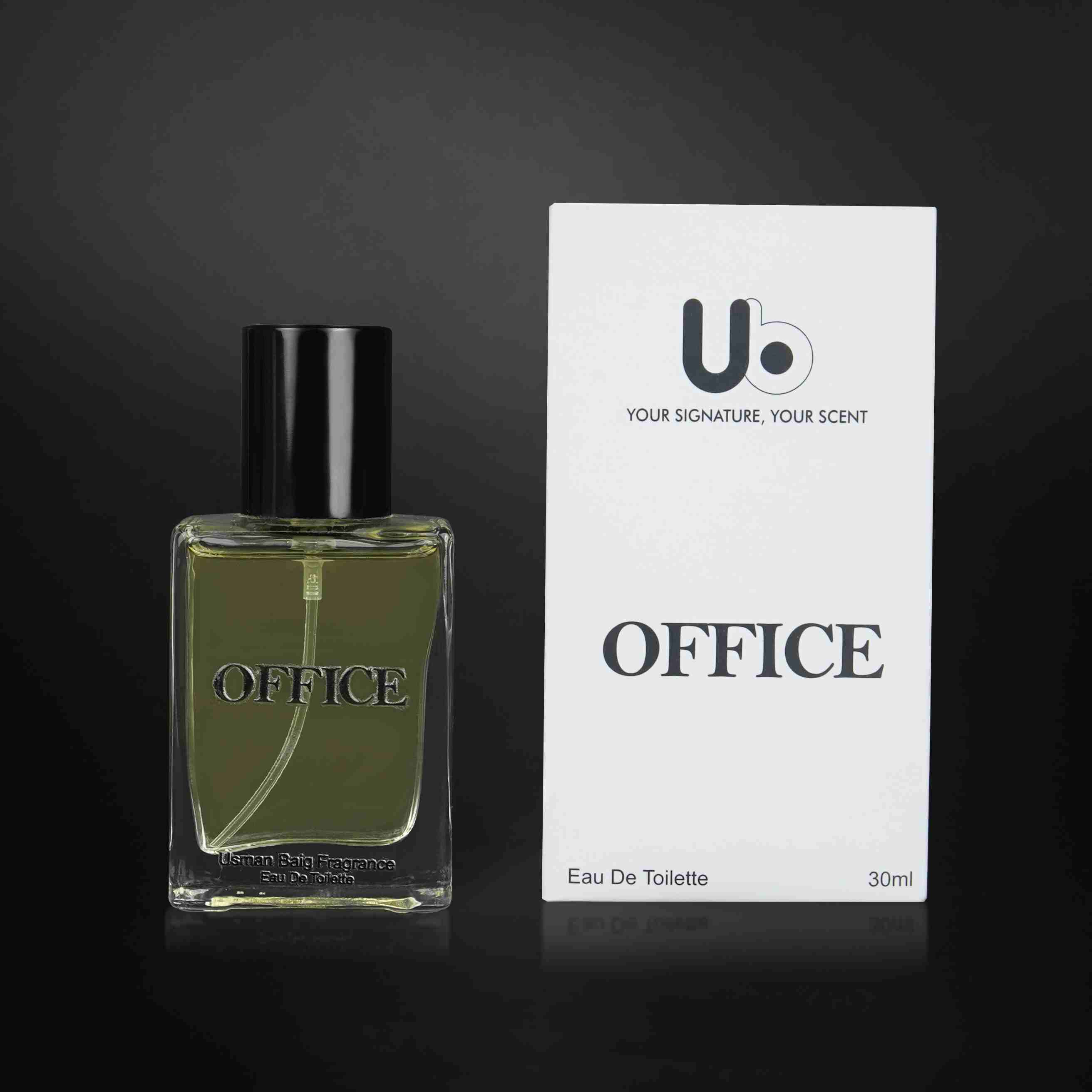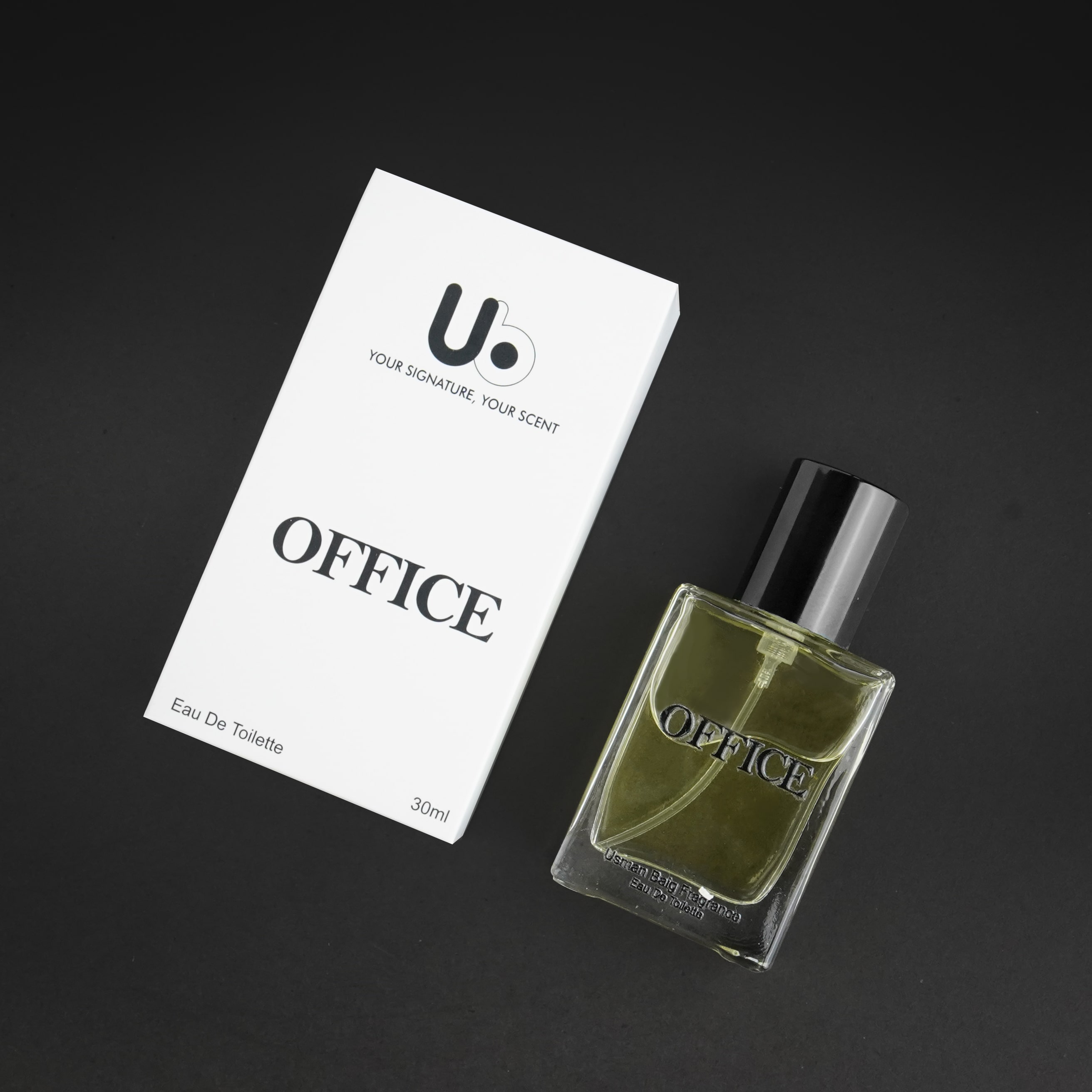 Office by UB Fragrance One is a fresh, woody, spicy, and subtly floral scent designed for ambitious men, featuring prominent notes of Ambroxan, Bergamot, and Woods, with floral hints (Jasmine), Ambergris, Musk, and Patchouli, creating a confident, long-lasting aroma perfect for daily professional wear, transitioning from desk to dinner. It opens bright and fresh, develops a smooth heart, and settles into a deep, charismatic woody base, making it a versatile, sophisticated signature scent.